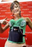 Solar-powered Model Yuko Ishida displays a "solar-power generator bra" presented by lingerie maker Triumph International Japan Ltd. during a press unveiling in Tokyo on May 14. The eco-green bras, made with organic cotton that have met the international safety standards, generates electric power by a detachable solar panel so that the wearer can illuminate a compact electric indicator and use i-pods, cell phones and other electric gadgets on the beach without worrying batteries may run out.