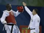 Cuba's Angel Valodia Matos, left, kicks match referee Sweden's Chakir Chelbat in the face during a bronze medal match against Kazakhstan's Arman Chilmanov in the men's taekwondo +80 kilogram class at the Beijing 2008 Olympics in Beijing, Saturday, Aug. 23, 2008. Matos attacked the official, throwing punches and kicks, after being declared the loser in his bronze medal match.